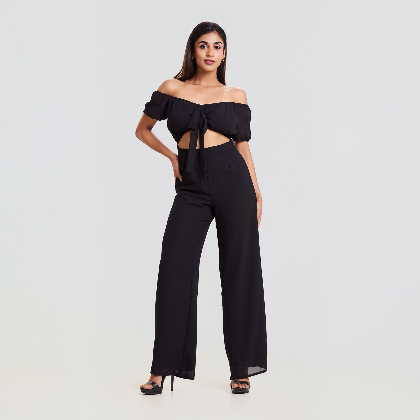 Off Shoulder Tie Front Chiffon Jumpsuit
