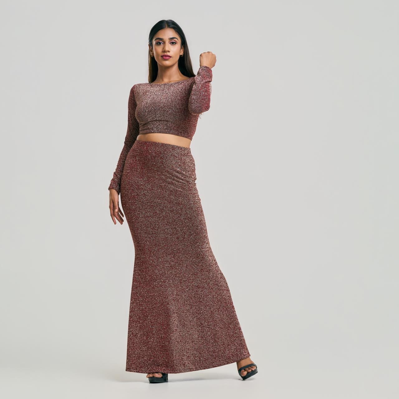 Boat Neck Criss Cross Back Shiny Crop Top & Fishtail Skirt Set
