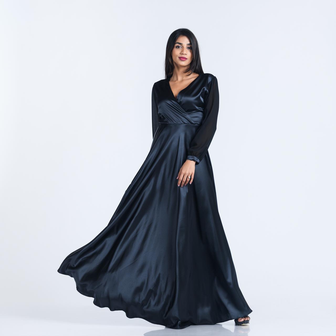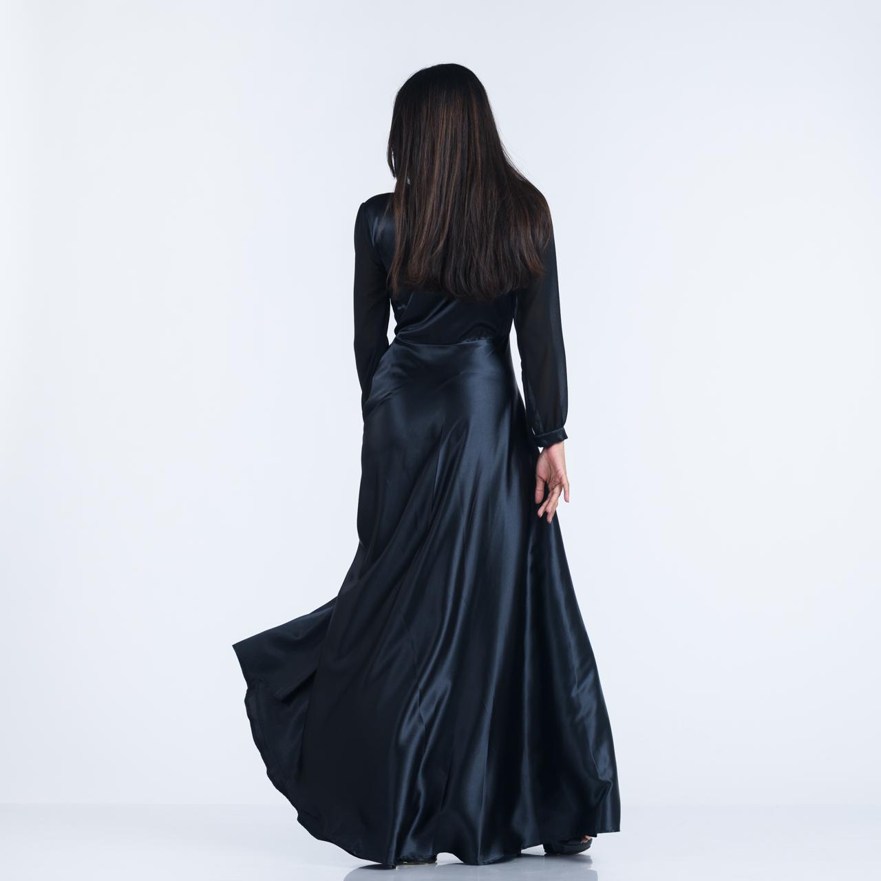 Mock Wrap Satin Evening Gown w/ Chiffon Sleeves